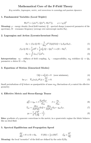 The author apologizes for the brevity of this mathematical overview. The formulas presented here are only a simplified outline of the full analytical framework of the F-Field Theory, intended to illustrate its core structure in a compact visual format.